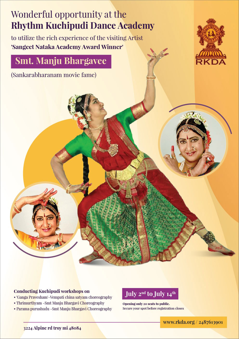 Founded in 2009 by Smt.Niveditha Priyadarshini, RKDA is a Detroit-based dance school committed towards education of Kuchipudi, a classical Indian dance style. Academy aims to create a community of Kuchipudi teachers and students in United States who can promote this dance form in the honest way fostering the traditional classical style along with RKDA contributions towards evolution of Kuchipudi dance form.